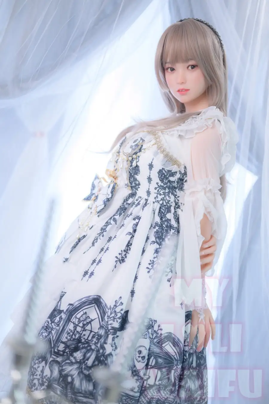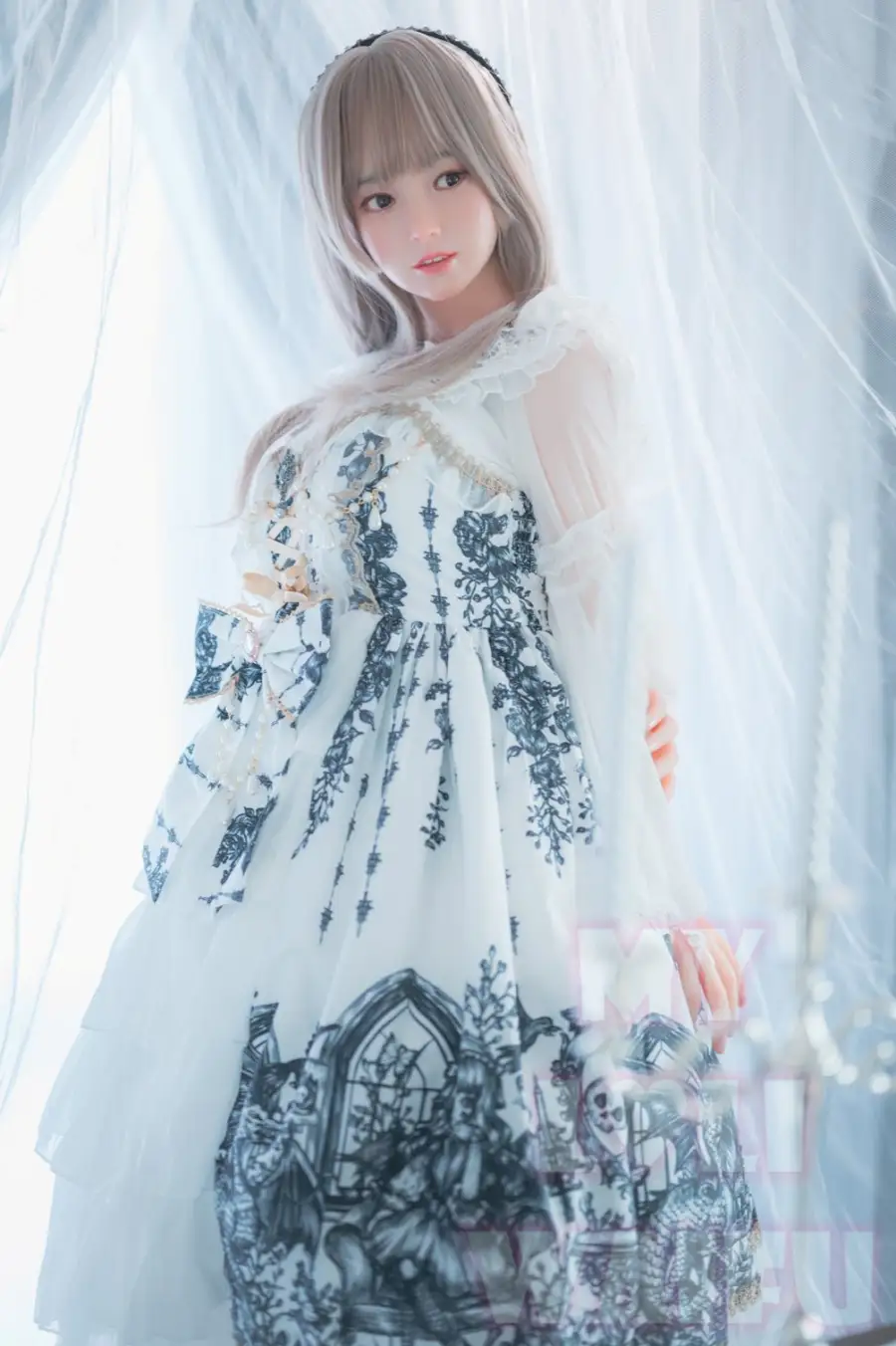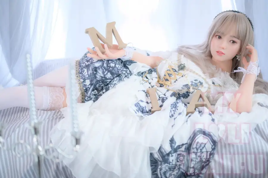 Mia is a loli girl. She is wearing a cute fluffy lolita princess dress. She wears a long silver wig and lies there like a princess. You can hardly imagine that under Mia's cute appearance, a pair of big breasts are hidden. Yes, Mia looks like a little girl, but she has big boobs. The soft breasts almost burst through that tiny dress, making it very fascinating.