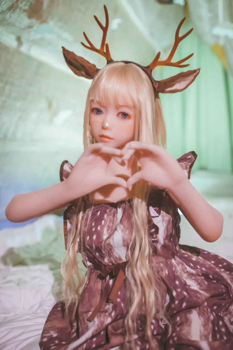 Freesia is an anime sex doll. On the early Christmas morning, Freesia cosplays a little elk. She wears an elk horn headdress on her head and wore a purple lolita dress. She looks like a beautiful elk.